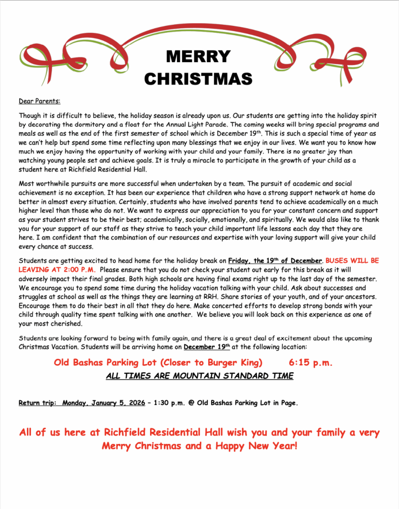 Christmas Vacation is coming soon – Dec. 20th through Jan. 5th. Bus leaves from RRH at 2 PM on Friday, Dec. 19th. Please pick up students in Page at 6:15 PM. (MST) Return bus leaves from Page on Monday, Jan. 5th at 1:30 PM (MST) for Richfield. Please see the attached letter.