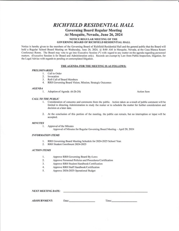 Richfield Residential Hall – Governing Board Meeting, Wed., June 26, 2024, at the Casablanca Hotel and Casino – 8:00 AM. (PDT)By Brent Gubler | April 10, 2024Posted in Uncategorized