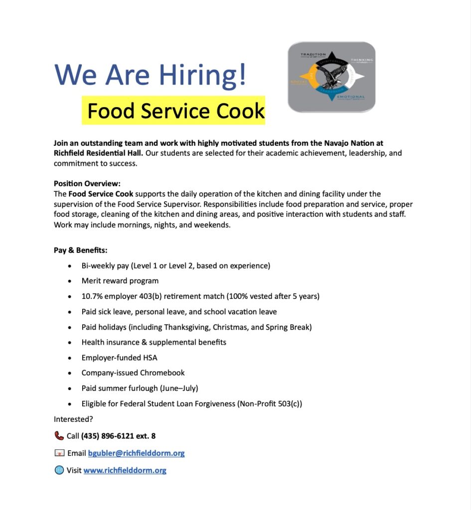 This position supports the daily operation of the kitchen. Duties include food preparation and service, proper food storage, cleaning, and interacting with students and staff. Please see the attached description and benefits. Call us at 435-896-6121 with any questions. Job application is available on the “Join Our Team” section in the staff section.