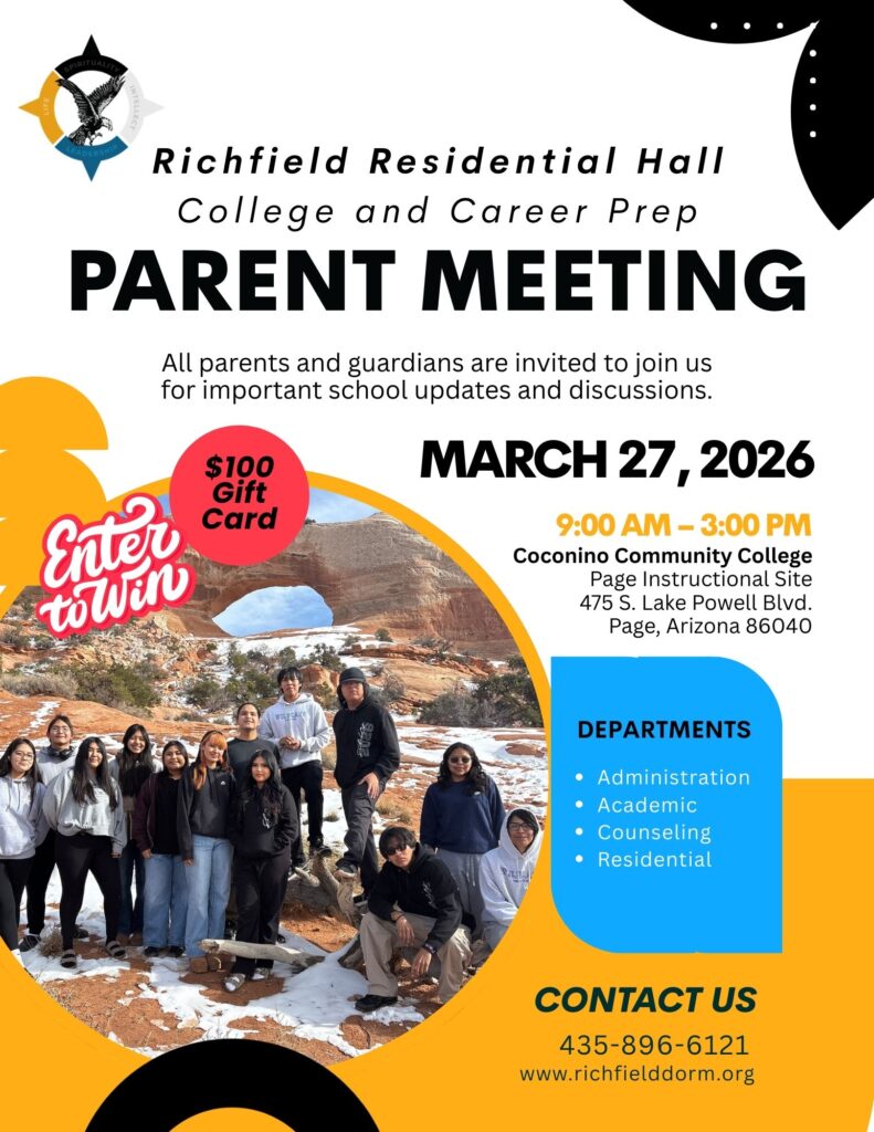 Richfield Residential Hall will be holding parent meetings on Friday, March 27th, in Page, AZ. We are meeting at Coconino Community College – 475 S. Lake Powell Blvd. Administration, counseling, academic, and residential staff will be there to give updates and information pertaining to your student. Students will be arriving in Page later that evening around 6 PM to begin their Spring Break.