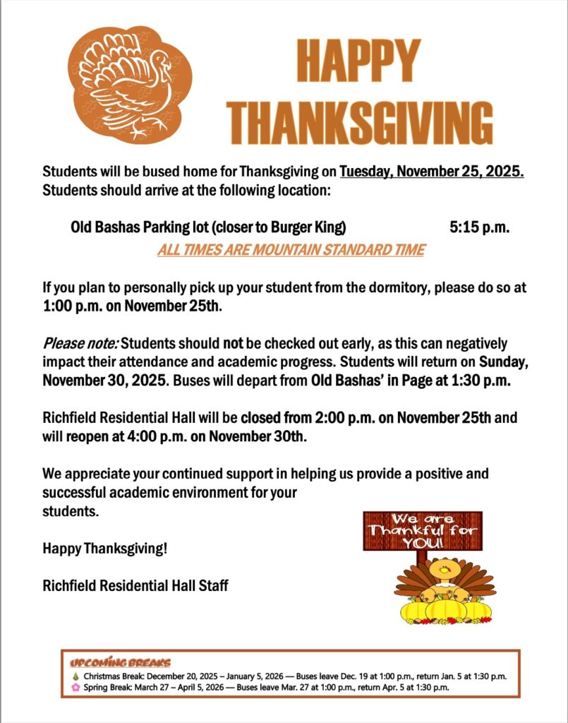 Thanksgiving Break is coming soon – Oct. 26 through Oct. 30. Bus leaves from RRH at 1 PM on Tues., Nov. 25. Please pick up students in Page by 5:15 PM. (MST) Return bus leaves on Sun., Nov. 30 at 1:30 PM (MST) for Richfield. Please see the attached letter.